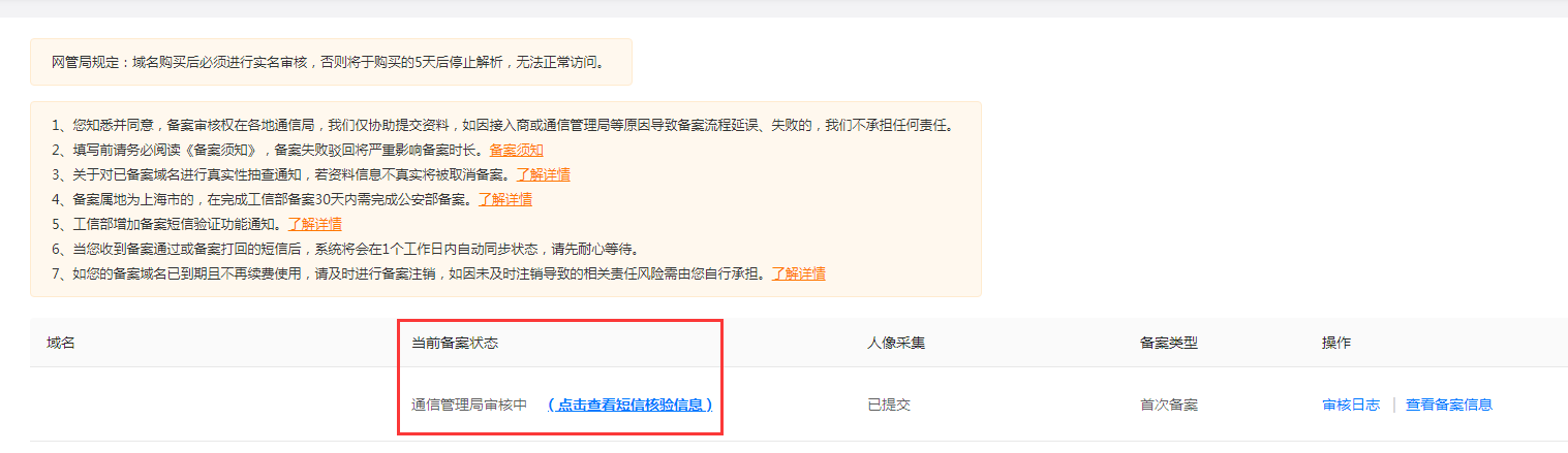 ※如果当前的备案状态为接入商审核中,需要等状态变为管局审核中了以后的5~10分钟左右才会收到短信。